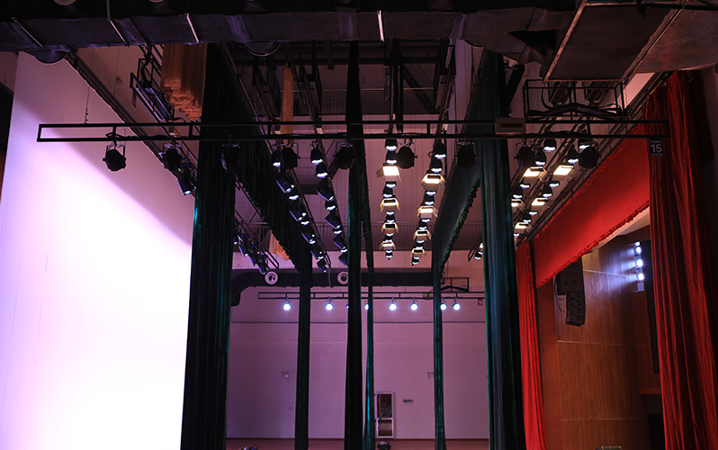 橫簾幕(橫條幕):懸掛在普通吊桿和加長桿上,位于鏡框舞臺臺口上方的幕布。與左右兩側的側簾幕相配合,起到控制演出空間的視線的作用。